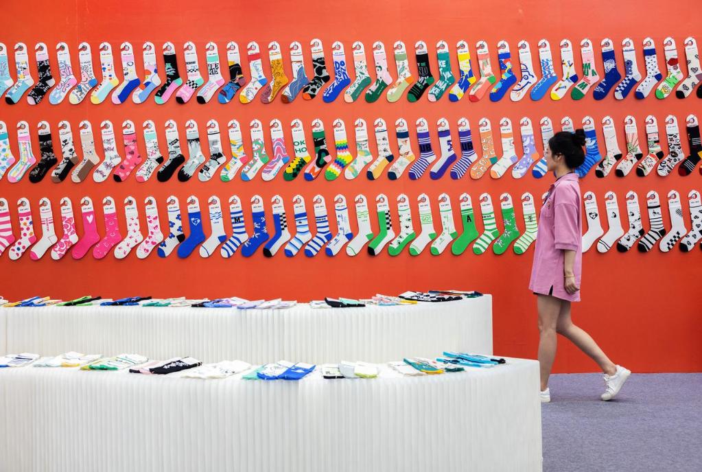 8月23日,一名女子在襪業(yè)博覽會上參觀。新華社發(fā)(郭斌攝)