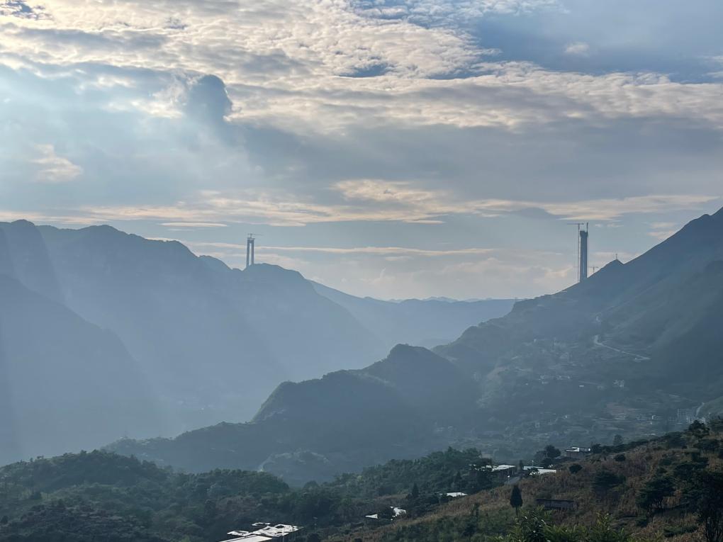 站在塔頂遠(yuǎn)眺,峽谷對岸是與安龍岸主塔遙相呼應(yīng)的另一個主塔——大橋六枝岸主塔,目前正加緊施工。