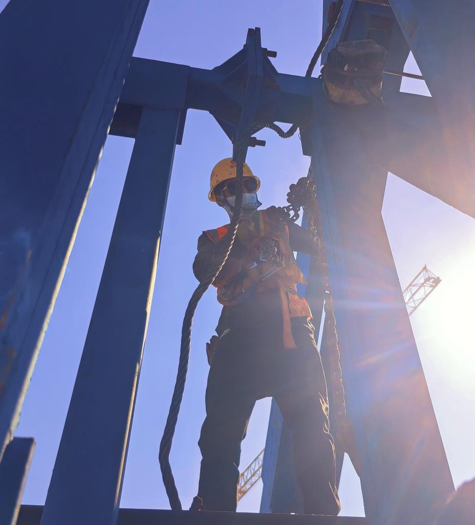 身處高空,記者內(nèi)心無比緊張。而一旁的馬海扯坡和工友們則顯得比較輕松,正有條不紊地在塔頂安裝門架,為即將開展的高空大重量吊裝做準(zhǔn)備。