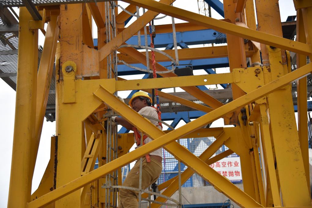 跟隨馬海扯坡的腳步,記者乘坐施工電梯一路爬升,抵達(dá)已封頂?shù)拇髽虬昌埌吨魉敗=痫L(fēng)送爽,但當(dāng)跳出云海的日頭直射在毫無遮擋的塔頂時,身處其上的人們,臉上火辣辣的。