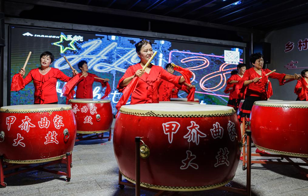 在山東省榮成市夏莊鎮(zhèn)甲夼曲家村鄉(xiāng)村大灶臺,村里的志愿者為食客們表演漁家大鼓。新華社發(fā) 李信君攝