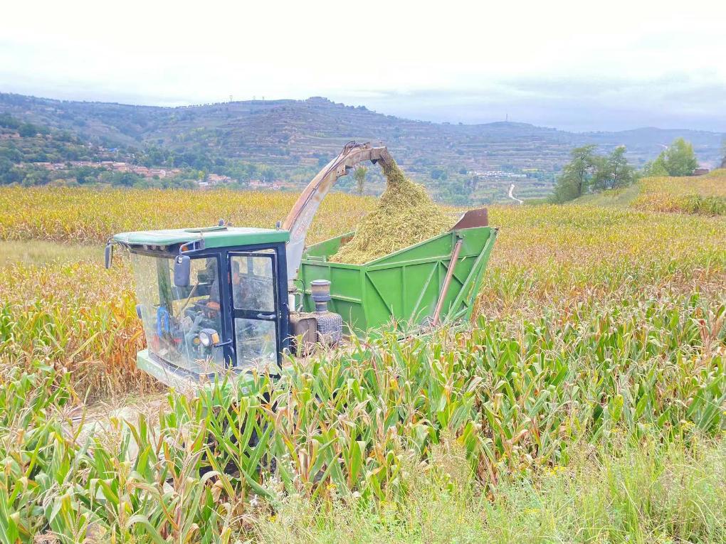 在新義村的一處農(nóng)田里,玉米青儲機正在作業(yè)。(受訪者供圖)