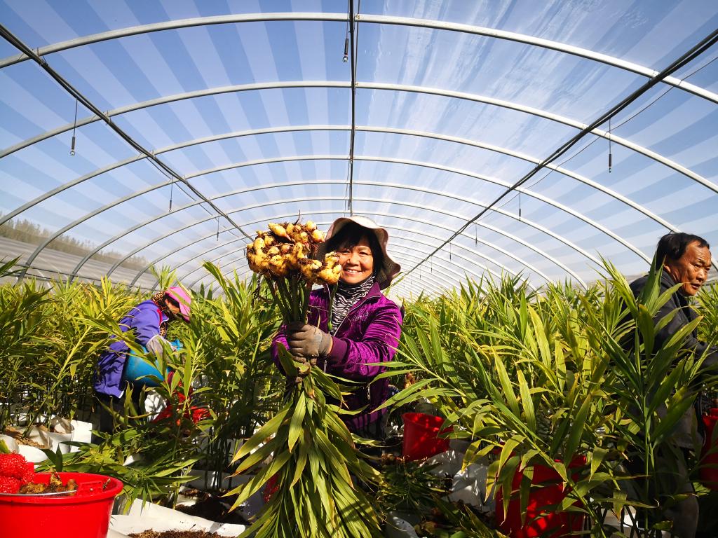 在山東姜公農業科技有限公司種植基地,大棚內種植的有機生姜迎來豐收。(新華社記者王志 攝)