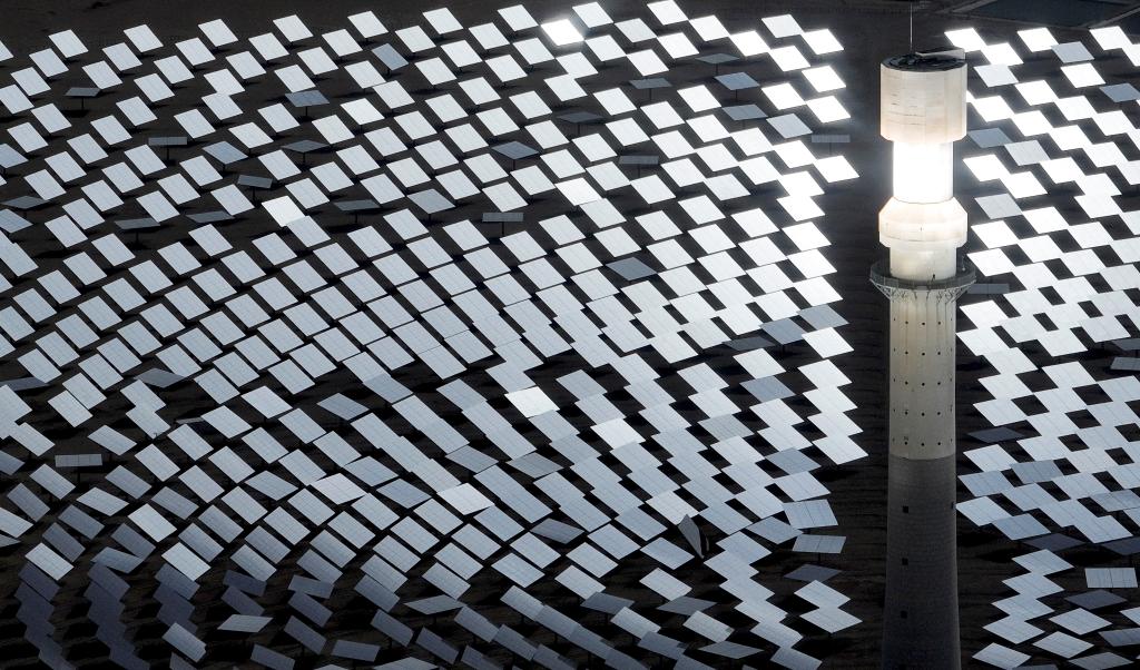 蔚藍色的光伏板在陽光照射下熠熠生輝,光能便轉化成源源不斷的電能;風力發電機的葉片迎風飛轉,風被“捕捉”進一條條輸電線;百米高的吸熱塔和“鏡子海洋”組成熔鹽塔式光熱電站,科技感與綠色減碳有機結合……
