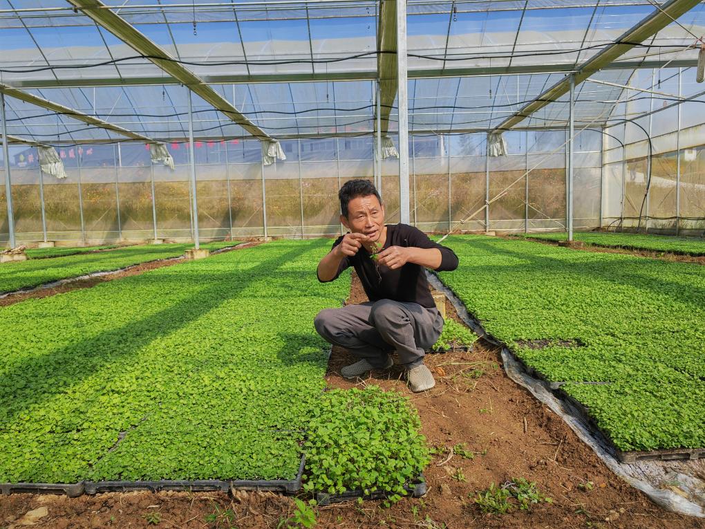 陳兆武在展示通過大棚培育的油菜苗。新華社記者張華迎 攝