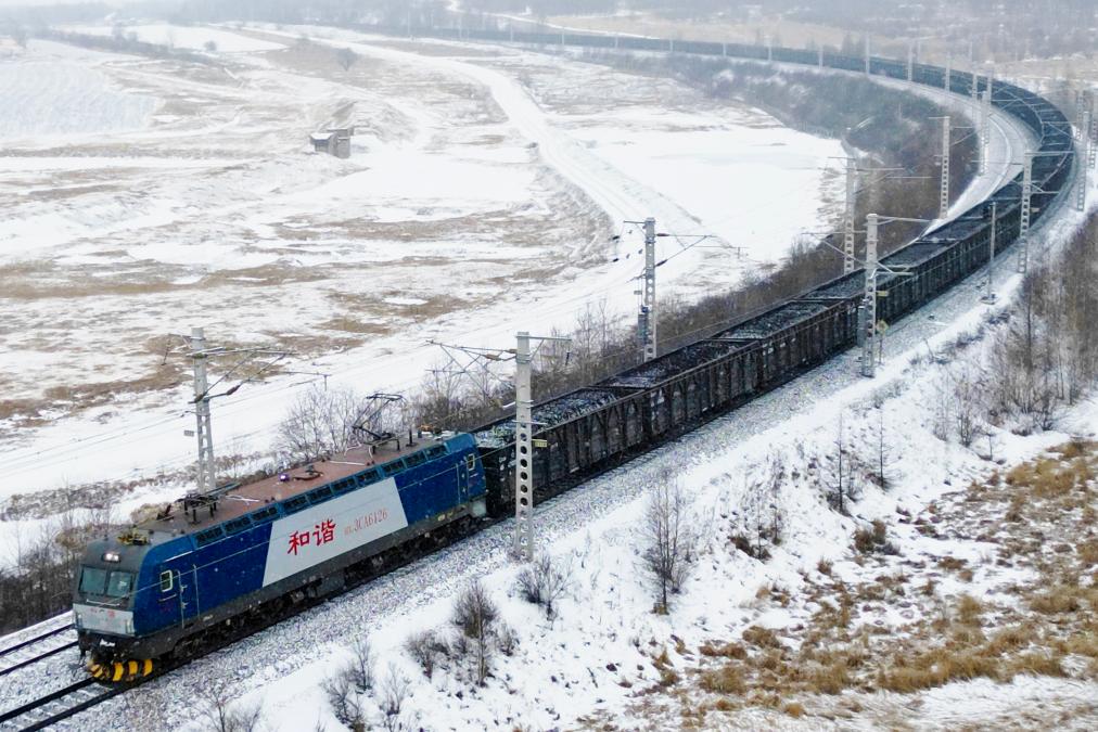 運輸物資的火車在寒風中呼嘯而過。(中國鐵路哈爾濱局集團有限公司供圖)