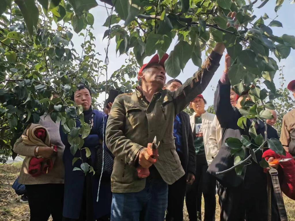 西張耿村邀請農技專家講授果樹修剪技術。(張倩 攝)