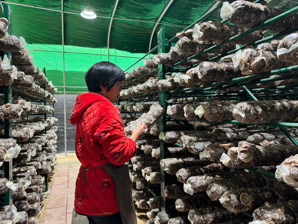 11月17日,杉洋村菇農在“光伏+”菇棚杉洋基地查看香菇生長情況。新華社記者 任彥逸 攝