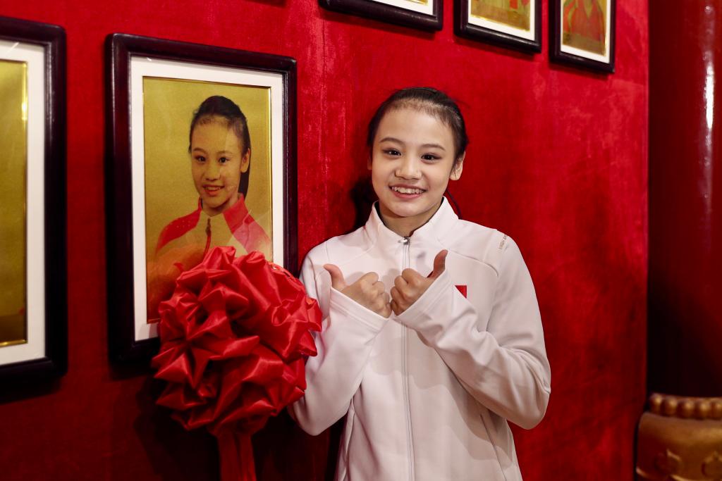 現(xiàn)役國家隊的小隊員向國家體操隊老前輩獻(xiàn)花