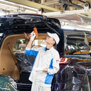 總裝車間內,工人正在安裝汽車后備箱。(侯毅超 攝)