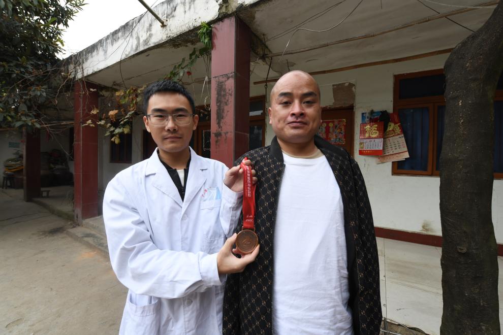 12月1日,在德陽廣漢市金輪鎮五里村,金輪鎮衛生院醫生周遠和江崇君(右)一起展示江崇君在四川省第十屆殘疾人運動會上獲得的銅牌。新華社記者 唐文豪 攝