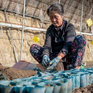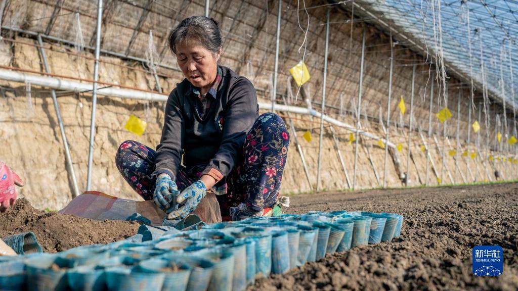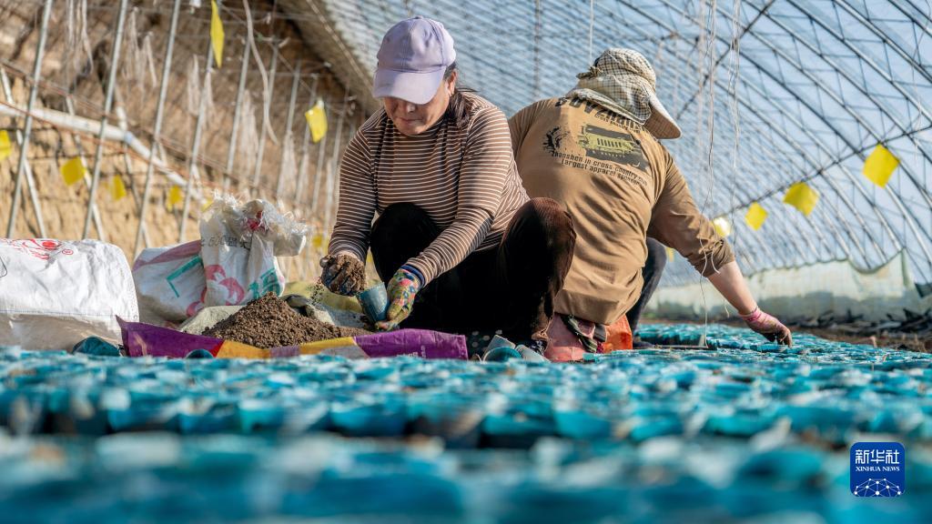 12月4日,在吉林省梨樹縣王家園子村一座育苗棚內,農戶在給育苗盆裝填培養土。新華社發(唐成卓 攝)