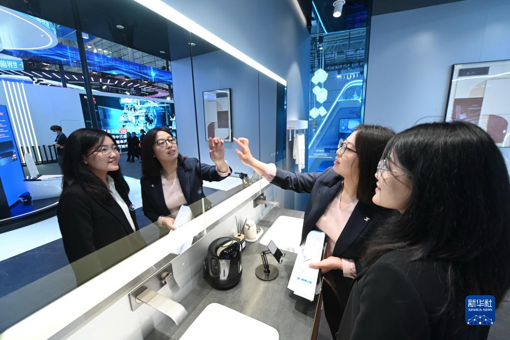 2023年4月26日,參觀者體驗支持鴻蒙智聯的九牧衛浴智能產品。新華社記者 林善傳 攝