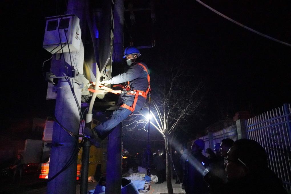 12月19日,在甘肅省臨夏回族自治州積石山保安族東鄉族撒拉族自治縣中西醫結合醫院門口,電力部門工作人員搶修電力設施。新華社記者 馬希平 攝