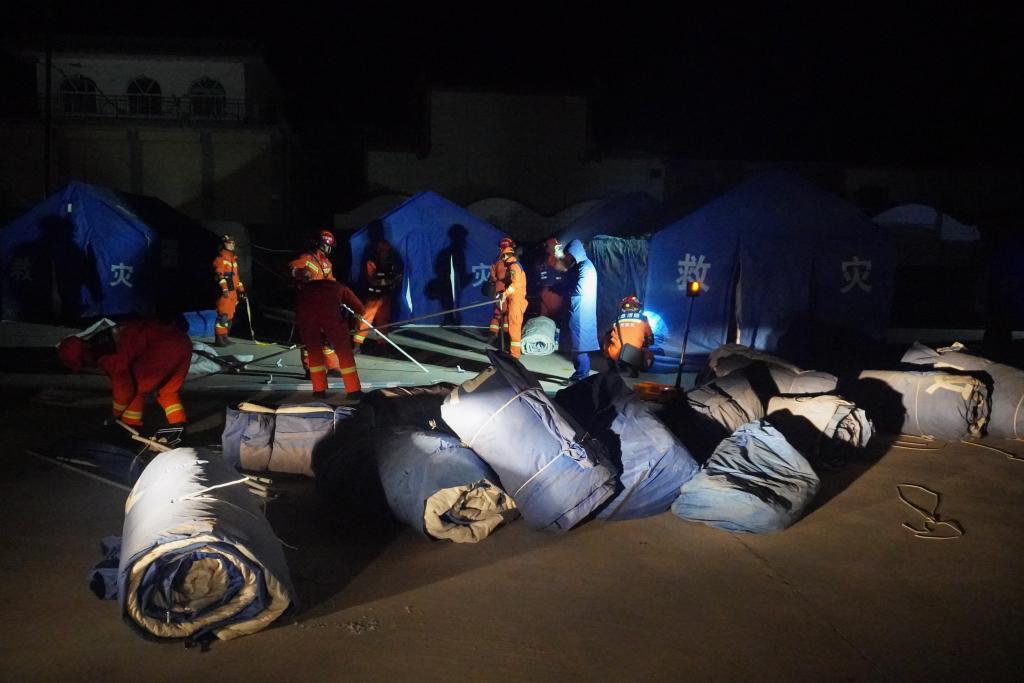 12月19日,在甘肅省臨夏回族自治州積石山保安族東鄉族撒拉族自治縣大河家鎮大河村,消防人員搭建救災帳篷。新華社記者 馬希平 攝