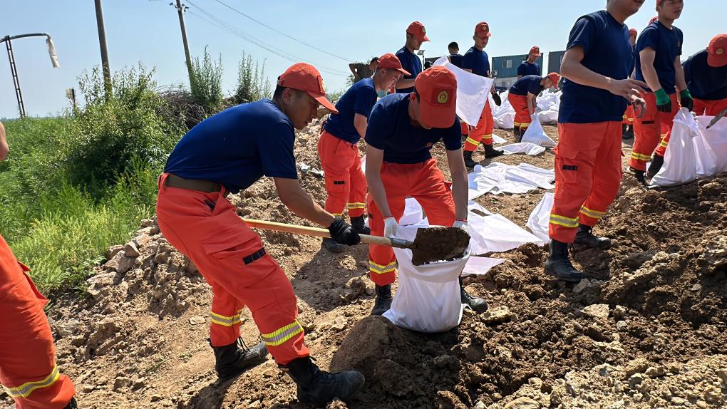 在黑龙江省尚志市老街基乡龙王庙村,哈尔滨森林消防支队指战员正在新兴桥处装填沙袋、垒筑堤坝。(哈尔滨森林消防支队供图)