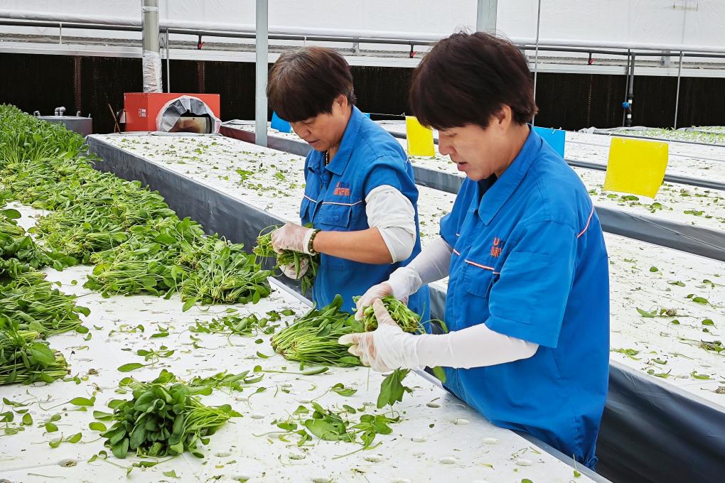 9月23日,横坎头村村民赵调姑(右)和工友在“红芯植物工厂”内采收菠菜。新华社记者林光耀 摄