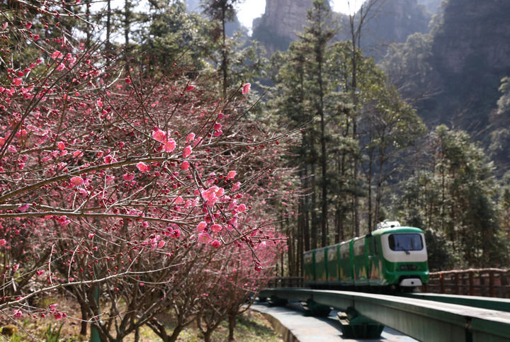 2025年2月15日,游人在张家界国家森林公园十里画廊乘观光电车游玩(无人机照片)。新华社发(吴勇兵摄)