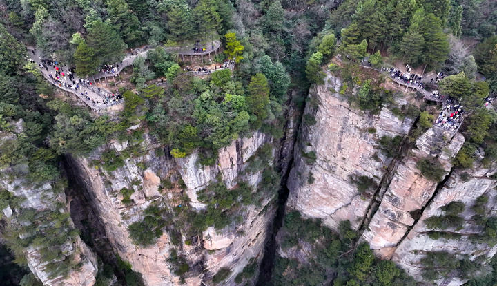 2025年2月5日,游客在张家界国家森林公园袁家界景区游玩(无人机照片)。新华社发(吴勇兵摄)