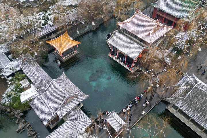 2025年1月26日,人们在山东省济南市趵突泉公园观赏雪景(无人机照片)。新华社发(郝鑫城摄)