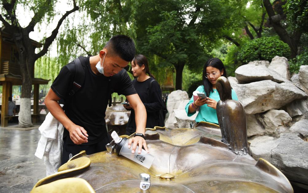游客在济南市护城河畔一处泉水直饮点接水(2020年6月5日摄)。新华社记者 王凯 摄