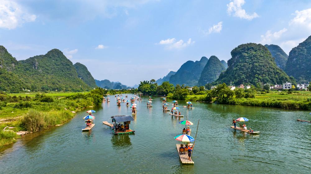 2023年10月3日,在广西桂林市,游客乘船游览漓江(无人机照片)。新华社发(刘峥 摄)