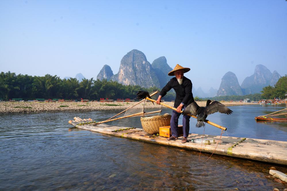 2024年11月2日,在广西桂林市阳朔县兴坪镇的漓江边,一名老人将鸬鹚放在竹筏上。新华社发(黄勇丹摄)