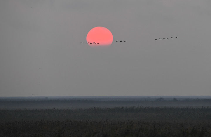 这是2022年11月8日拍摄的盐城湿地珍禽国家级自然保护区日出景色。新华社记者 季春鹏 摄