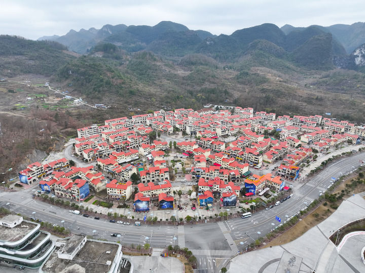 从空中俯瞰平塘县“天文小镇”(2月18日摄,无人机照片)。新华社记者 刘续 摄