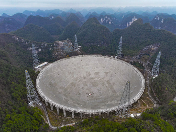 在“道坨天坑”周围约20平方公里的范围内,有十余个大小不等的天坑,深度在300米到600米之间。在天坑群中有一个叫“大窝凼”的天坑,仿佛一个天然的“巨碗”支架,将“中国天眼”——世界最大射电望远镜镶嵌在内;地下暗河如天然排水系统,让“中国天眼”免于积水之忧;而环绕的群山也为“中国天眼”提供了优异的电磁环境。