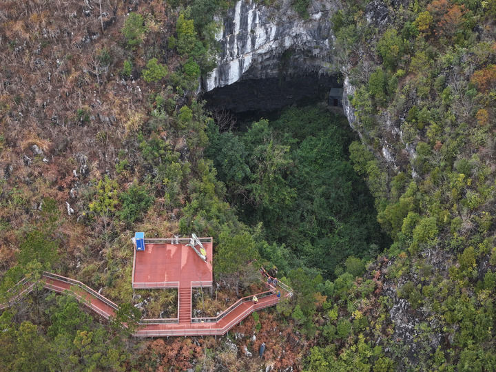游客在平塘县“平塘天硐”游玩(2月19日摄,无人机照片)。新华社记者 刘续 摄