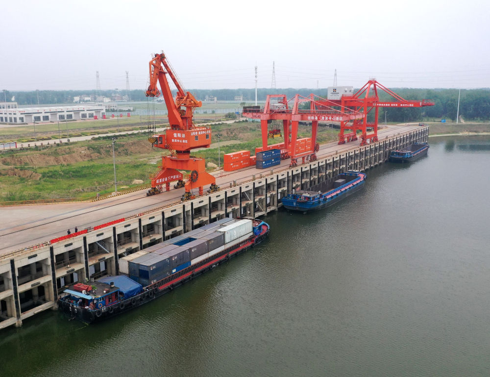 2024年6月5日,货船停泊在信阳港·淮滨中心港内(无人机照片)。新华社记者 李嘉南 摄