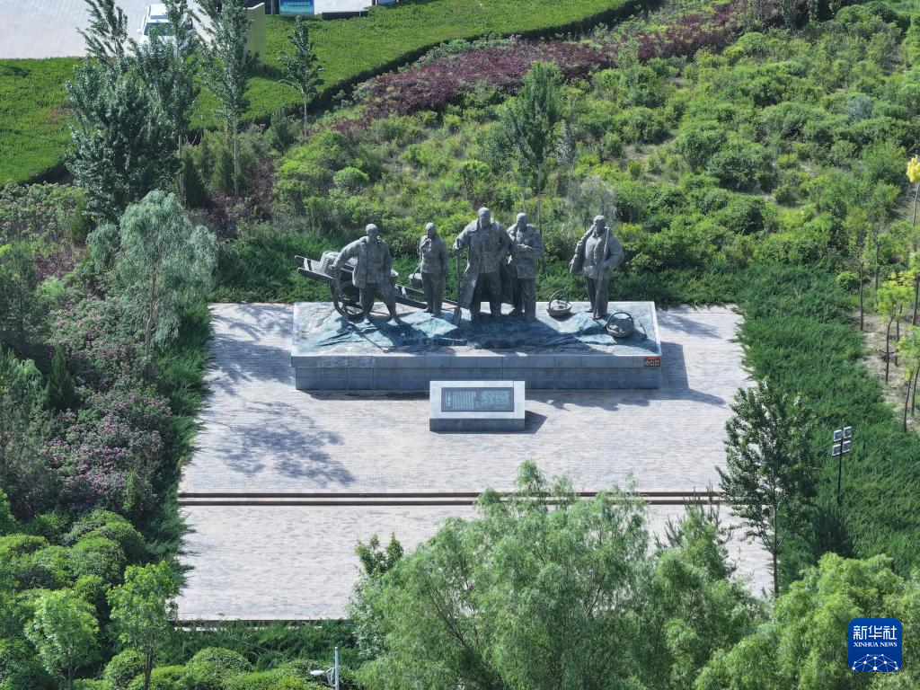 这是5月28日拍摄的位于内蒙古巴彦淖尔市临河区境内总干渠边的纪念雕塑(无人机照片)。 新华社记者 马金瑞 摄