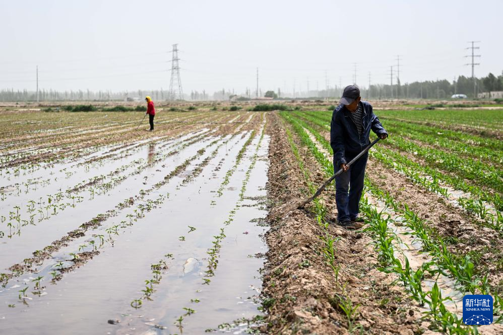 5月28日,农民在内蒙古巴彦淖尔市临河区浇灌农作物。 新华社记者 李志鹏 摄
