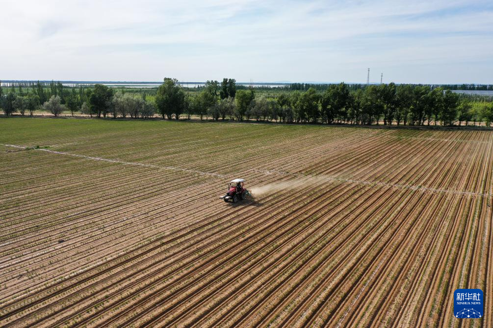 6月4日,农民操作农用机械在内蒙古巴彦淖尔市乌拉特前旗境内的农田里作业(无人机照片)。 新华社记者 李志鹏 摄