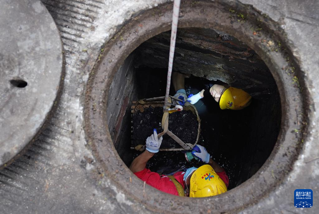 在赣州古城一条街巷,市政工作人员在对福寿沟管网进行清疏(6月18日摄)。新华社记者 万象 摄