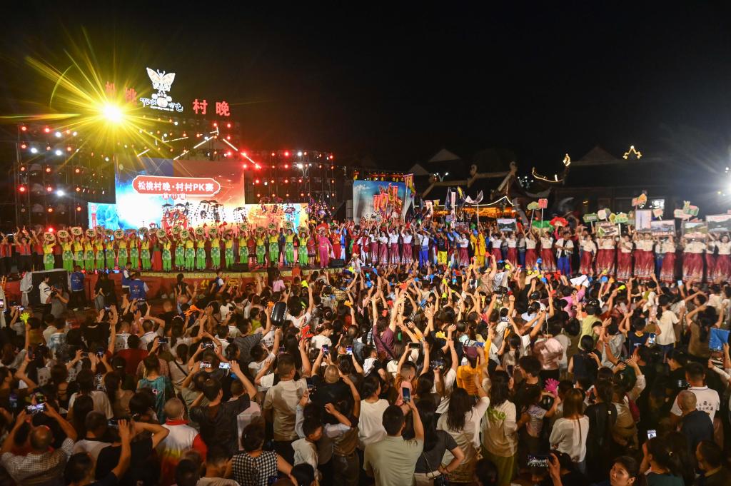 数字化让“村晚”走得更远。截至目前,松桃“村晚”已直播近30场,单场最高观看人次达185万,抖音话题“松桃村晚”视频播放量达5.2亿次。“村晚” 还实现从“送文化”到“创文化”的转变,过去多是专业演出队伍策划编排好节目,再到基层演出,村民作为观众被动接收文化服务;如今从节目主题构思、内容编排,到最终的舞台表演,均由村民自己完成,已有近4000位村民登台表演,170余项非遗得以展示。依托“村晚”带来的文旅热度,当地旅游消费等增加综合收入1200万元,同时解决上千人就业。