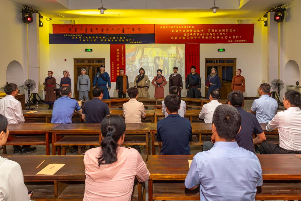 “欢迎来到五一会址!”身穿蒙古族传统服饰的“牧民代表”演员热情地引导游客步入1947年的历史现场。这部首个以“五一大会”召开为背景编排的沉浸式情景短剧《五一大会》,让游客仿佛亲历那一历史时刻。
