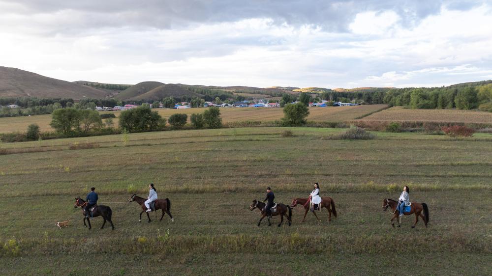 游客在乌兰浩特市葛根庙镇体验“重走骑兵路”红色主题骑行(无人机照片)。新华社记者贝赫 摄