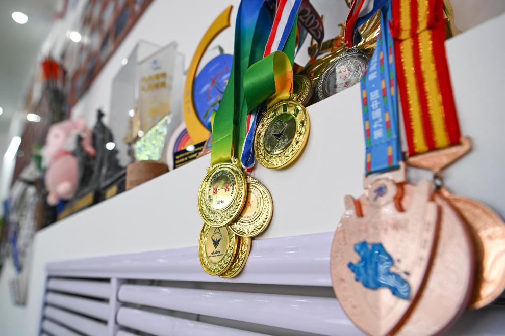 这是吴俊亮曾经参赛获得的部分奖牌与奖杯(10月25日摄)。新华社记者 胡虎虎 摄