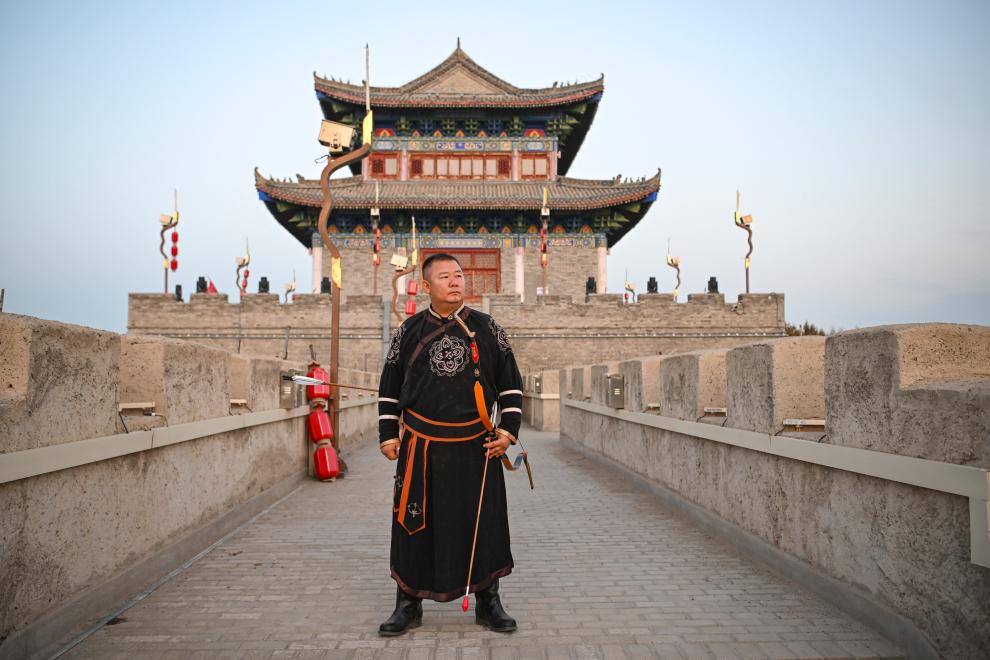 吴俊亮手持弓箭在察布查尔锡伯自治县锡伯古城景区城墙上(10月24日摄)。新华社记者 胡虎虎 摄