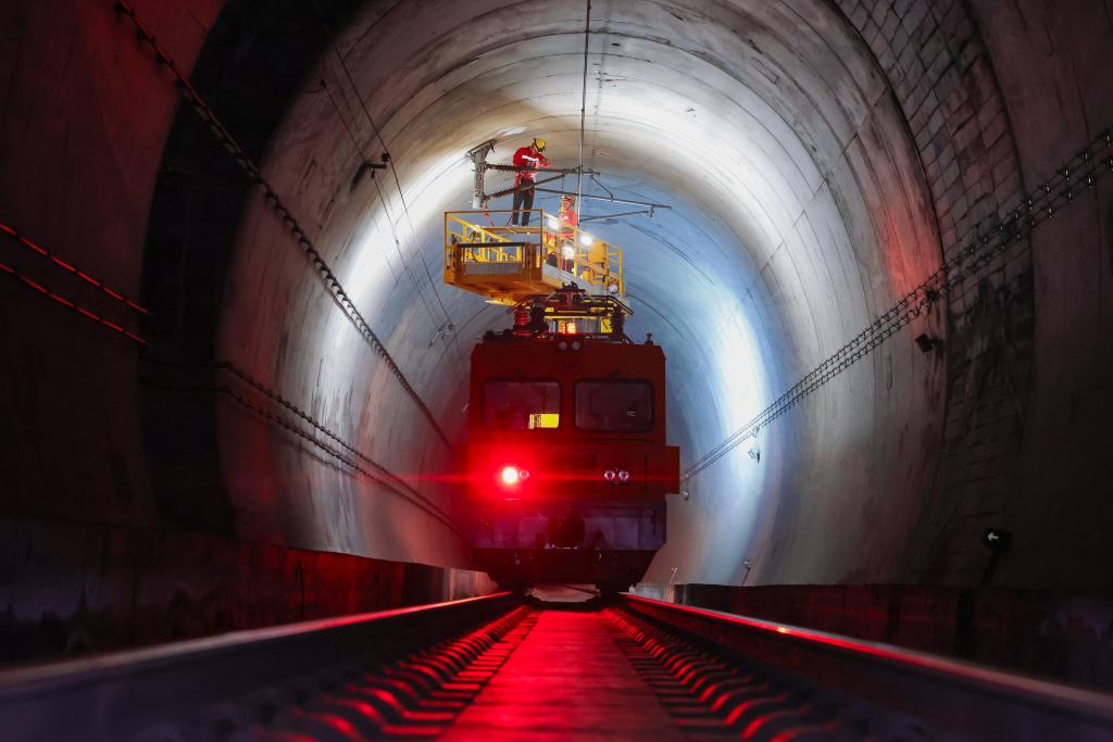 福州供电段永泰供电工区的接触网工在青云山隧道检查接触网设备。新华社发(胡鹏 摄)