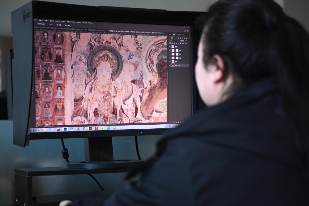 敦煌研究院文物数字化保护团队图像处理工作人员年海丽在拼接壁画图像(2023年4月25日摄)。新华社记者 陈斌 摄