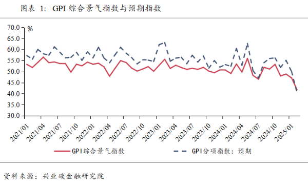 2025年2月GPI综合景气指数为41.7%。受春节假期和2月份工作日较少等因素的影响,2月GPI综合景气指数较上月下降5.4个百分点,仍处于收缩区间。此外,本月调研结果显示,绿色产业预期指数也有较大幅度下降。