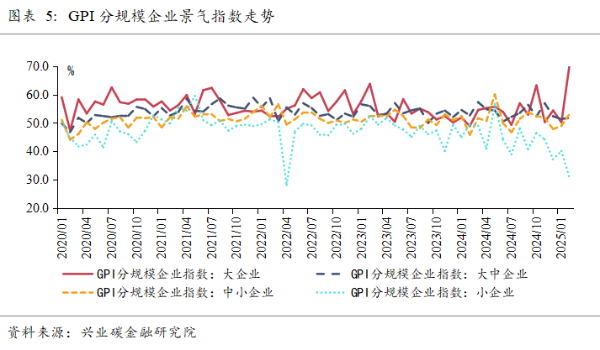 分企业规模来看,本月GPI调研结果显示,不同规模企业的绿色产业指数分化程度扩大,大型企业景气指数有较大幅度提高,小型企业景气指数明显下滑。而对于大中型、中小型企业,景气指数也略有增加,均落于扩张区间。(兴业研究 徐金、方琦、钱立华)
