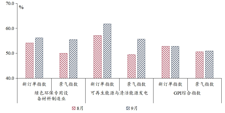 9月政策推动绿色环保专用设备材料制造、可再生能源与新能源发电行业景气度回暖。9月22日,国家能源局等部门联合发布《关于推进能源装备高质量发展的指导意见》,支持能源装备绿色高端发展;9月12日,国家发展改革委、国家能源局印发《关于完善价格机制促进新能源发电就近消纳的通知》,旨在推动新能源实现更高水平的就近消纳。9月GPI调研结果显示,绿色环保专用设备材料制造、可再生能源与新能源发电行业景气指数分别环比升高5.5和6.3个百分点,均落于扩张区间。此外,近期绿色环保专用设备材料制造行业景气指数与环保设备板块股票指数的涨跌走势较为同步。
