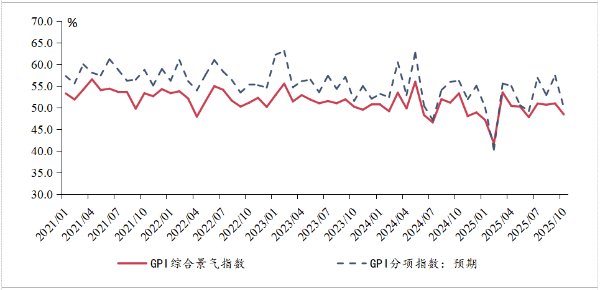 受国庆、中秋双节长假影响,10月绿色产业景气出现季节性回落。2025年10月GPI指数为48.4%,较上月降低2.5个百分点,落于临界点之下。同时,10月预期指数也有所下降,较上月降低7.4个百分点,但仍处扩张区间。