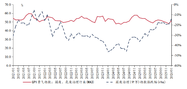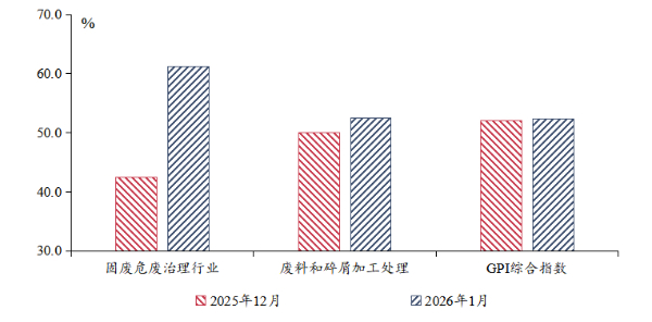 分行业来看,1月多项政策出台,有力推动了固废危废治理行业景气度显著改善。1月4日,国务院印发《固废综合治理行动计划》,作为“十五五”期间固废治理领域的纲领性文件,明确了到2030年重点领域固体废物专项整治取得明显成效等具体目标,并从源头管控与减量、收集转运与贮存、资源化利用、无害化治理进行了全链条部署,旨在坚决遏制固体废物增长势头,推动行业向精细化、资源化转型。1月16日,工业和信息化部等六部门联合印发《新能源汽车废旧动力电池回收和综合利用管理暂行办法》,遵循“全渠道、全链条、全生命周期”管理的基本思路,为加强动力电池回收利用管理提供了法律依据。1月19日,生态环境部发布《危险废物排除管理清单(2026年版)》,并废止了2021年版清单,与2025年实施的《危险废物豁免管理清单(2025版)》共同构成了当前危险废物精细化管理的新体系。受政策利好的影响,1月GPI调研结果显示,固废危废治理行业景气指数为61.3%,自近期低点显著反弹,重返扩张区间。并且,近期固废危废治理行业景气指数与固废治理板块股票指数涨跌走势表现出较高一致性。此外,1月废料和碎屑加工处理行业景气指数也环比上升2.5个百分点,延续扩张,产业链上下游协同回暖。
