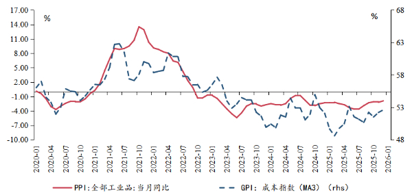 从分项指数来看,供需方面,1月新订单指数较上月提高1.2个百分点,持续位于扩张区间;同时,1月生产指数环比提升5.0个百分点,进口指数亦环比提高12.5个百分点,绿色企业生产活动明显回暖。生产端的良好表现支撑1月GPI维持在扩张区间的主要动力。资金周转方面,1月资金指数仅微降0.1个百分点,仍处于荣枯线以上,显示出较强韧性。成本方面,1月成本指数环比下降了0.5个百分点,成本压力小幅缓解,结合PPI当月同比持续为负,1月指数仍处于历史较低区间,整体成本压力可控。