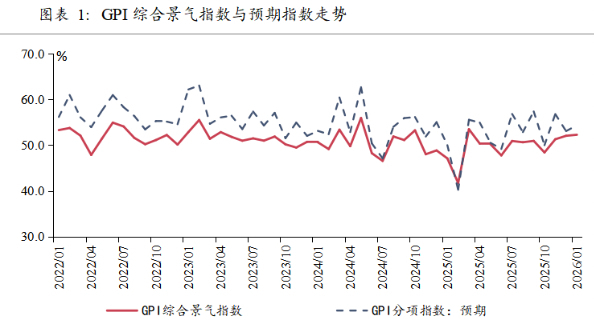 2026年1月GPI指数为52.3%,较上月小幅回升0.2个百分点,连续处于扩张区间。与此同时,1月预期指数环比上升1.1个百分点至54.2%,市场对绿色产业发展信心有所增强。